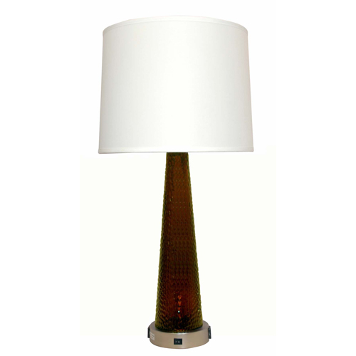This table lamp has a traditional, brown, brushed nickel finish that includes a parchment hardback shade.