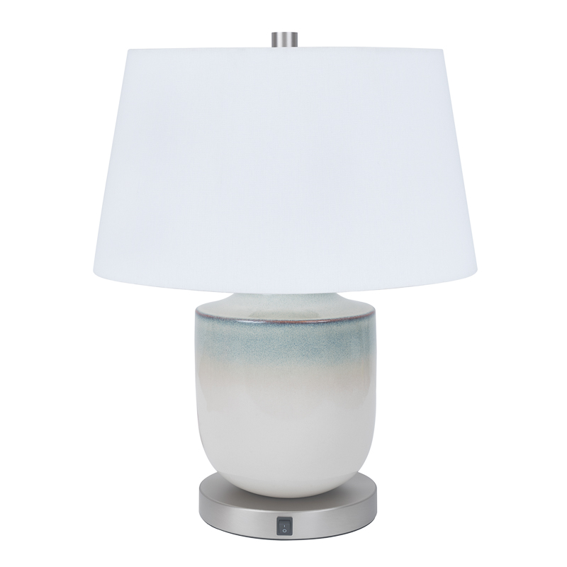 This table lamp has a brushed nickel finish with metal and a pale blue-green fading to soft cream ceramic body.