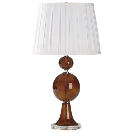 This table lamp has a transitional, dark amber finish that includes a white boxpleat shade.