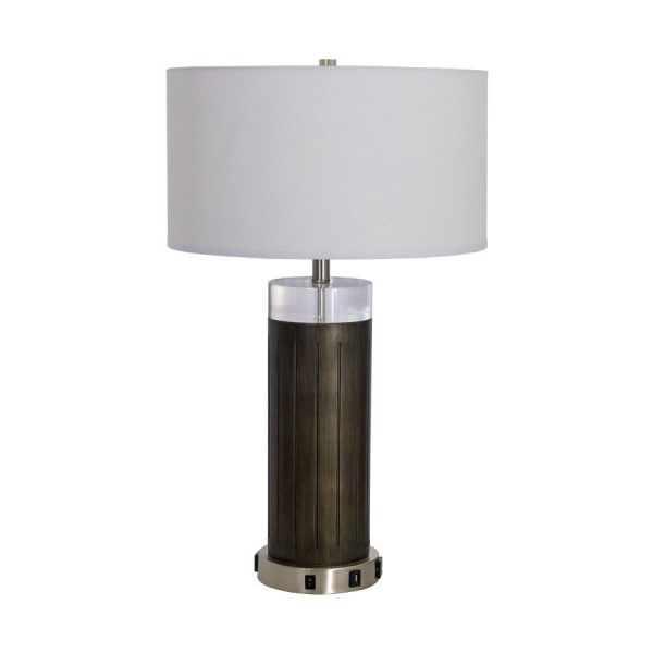 This table lamp has a blacken brass, brushed nickel finish that includes a white brussels hardback shade.