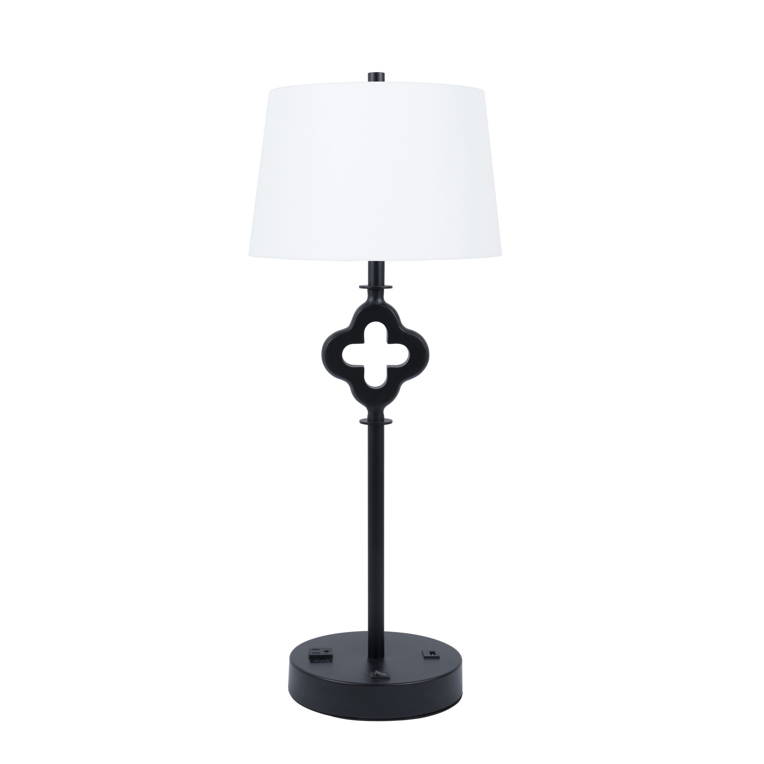 This table lamp has a matte black finish that includes a cream fabric shade.