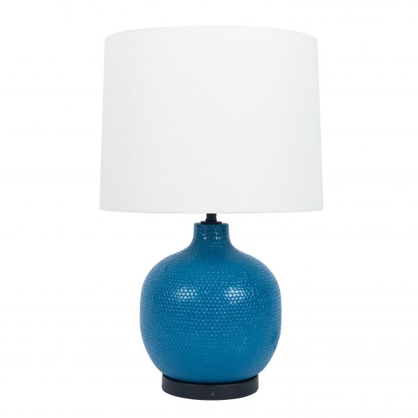 This table lamp has a blue ceramic body with a matte black metal base.