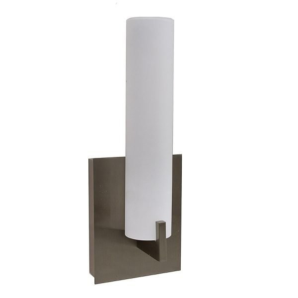 This wall sconce has a brushed nickel finish that includes a etched opal glass shade.