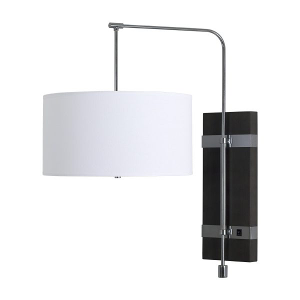 This headboard sconce lamp has a brushed chrome, wood finish that includes a white brussels hardback shade.