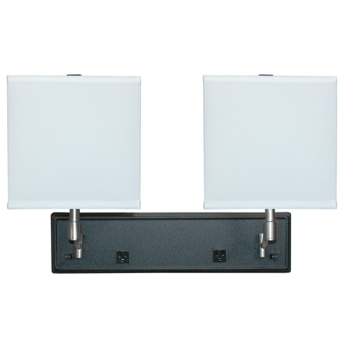 This headboard sconce lamp has a modern, black finish that includes a white square hardback shade.