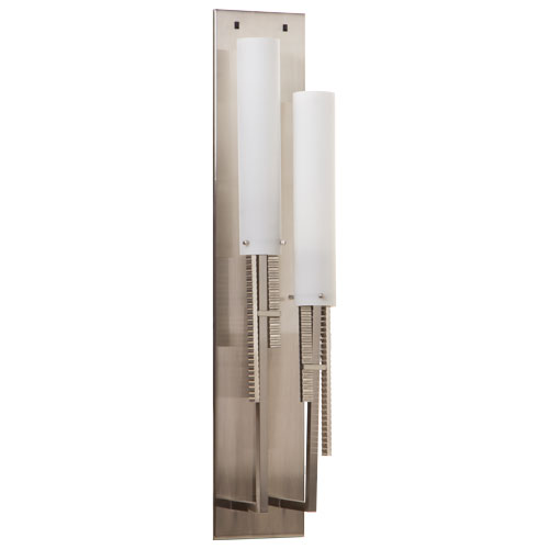 This headboard sconce lamp has a satin nickel finish that includes a white frosted acrylic shades.