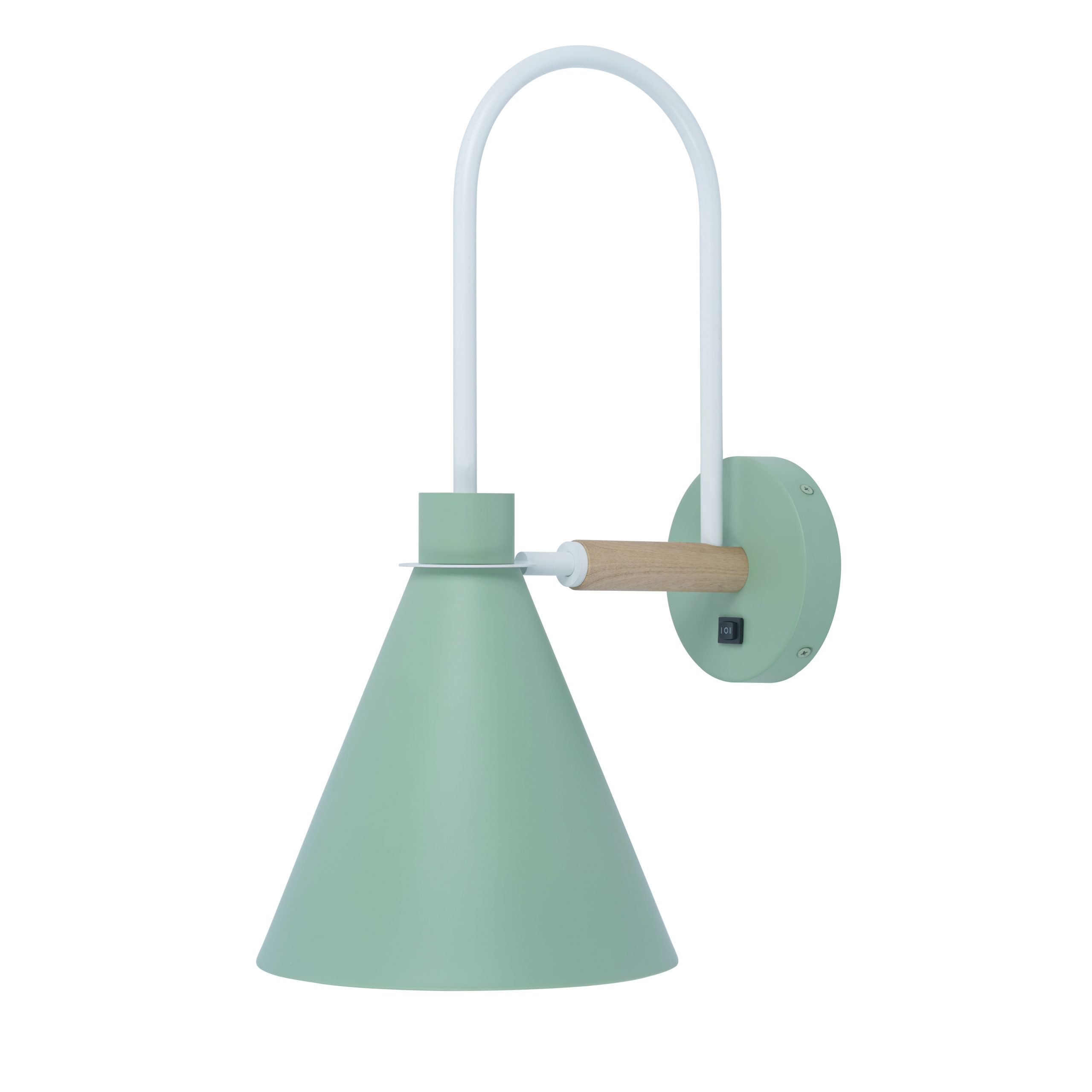 This headboard sconce has a agate green, white and landmark wood finish with metal.