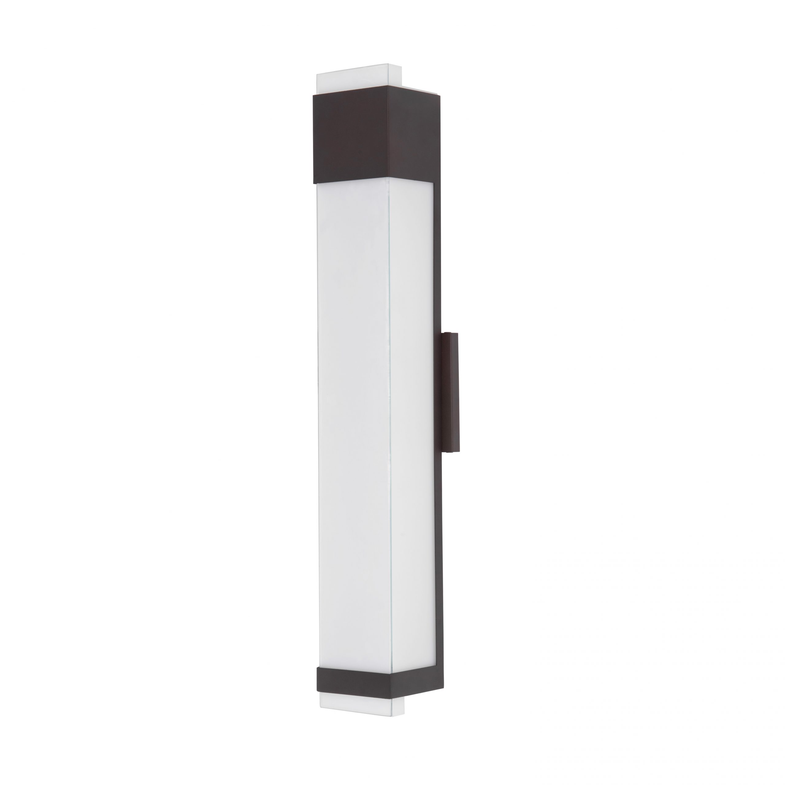 This wall sconce has a mineral bronze finish and white frosted acrylic shade.