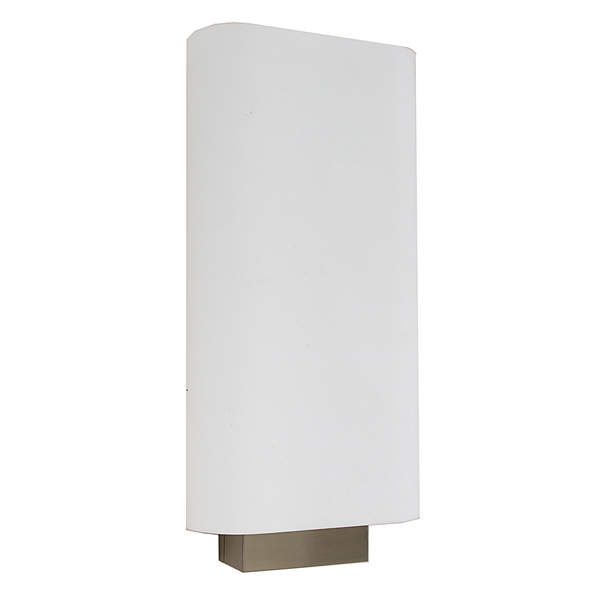 This wall lamp has a brushed nickel finish that includes an oval white acrylic diffuser.