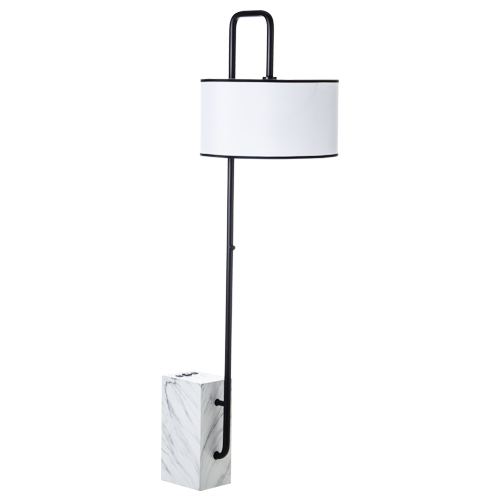 This floor lamp has a black finish that includes a white shangtung hardback shade with black trim.